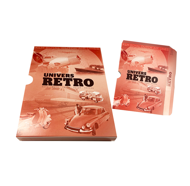 Habillage avec papier noir mat.Personnalisation par marquage à chaud en Blanc sur couvercle.